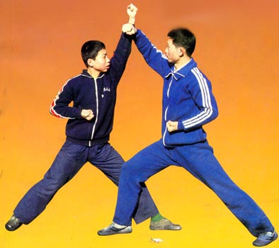 Methods of barehand combat are divided on three divisions - high, middle and low. They are called high, middle and low levels. High level: diao (cling), na (catch), suo (seal up), dai (pull), gou (cling by hook), lou (rake up), bao (plane), da (hit), beng (collapse), tiao (rip up), pi (cut) and za (break); middle level: zhan (touch), nian (stick), lian (continue), sui (follow), xi (attract), xie (unload), rou (soft), hua (change), tui (push), tuo (raise), ling (control), dai (pull), zhan (twirl), zhuan (turn), niu (screw), zeng (skin, strip), aibang (contact by arms), jikao (pressing lean), weishen (pressing by the body), kaoda (leaning strike); low level: ti (kick by stretched leg), dian (point kick), jie (stop), zhuang (push off), gou (cling by hook), gua (hang), cai (tread on), pian (go on circle), die (stumble), pu (bang), gun (roll), fan (overturn), qianhou saotang (sweep by leg forward and backward), zuoyou chengba (left and right push-raising). All parts of body are used in movements.