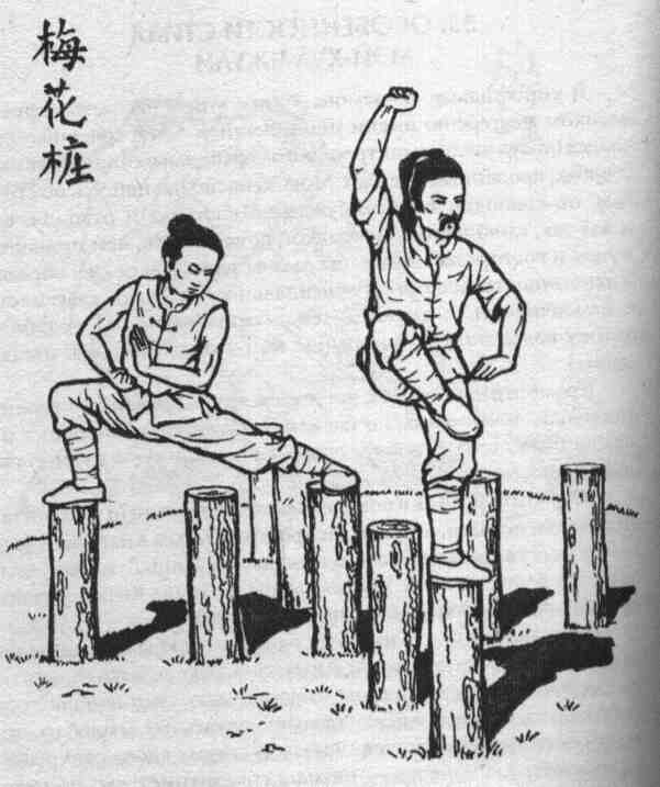 Old meihuazhuang masters told that in the past in meihuazhuang all training happened on the tops of pillars. On platform during executing of set every step is step from one pillar on another. Minimal pillar's height - 1m, when skill improves - pillars grow.
